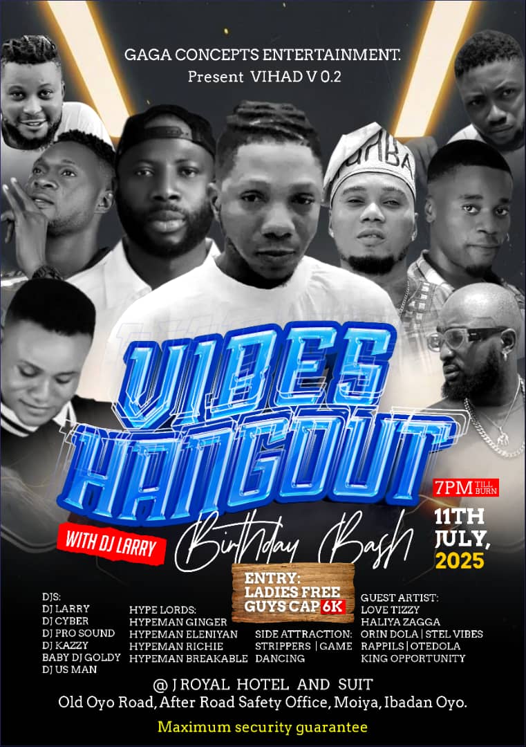GAGA ENTERTAINMENT CONCEPTS is gearing up to take the entertainment scene by storm with its highly anticipated event, VIBES HANGOUT VOLUME 2 (VIHAD V 0.2). Scheduled for July 11, 2025, at 7 PM, the event will take place at the JROYAL HOTEL AND SUITE, located on Old Oyo Road, after the Federal Safety Office in Moniya, Ibadan, Oyo State. This second edition promises to be even more thrilling than the first, with an array of exciting activities planned to captivate attendees.