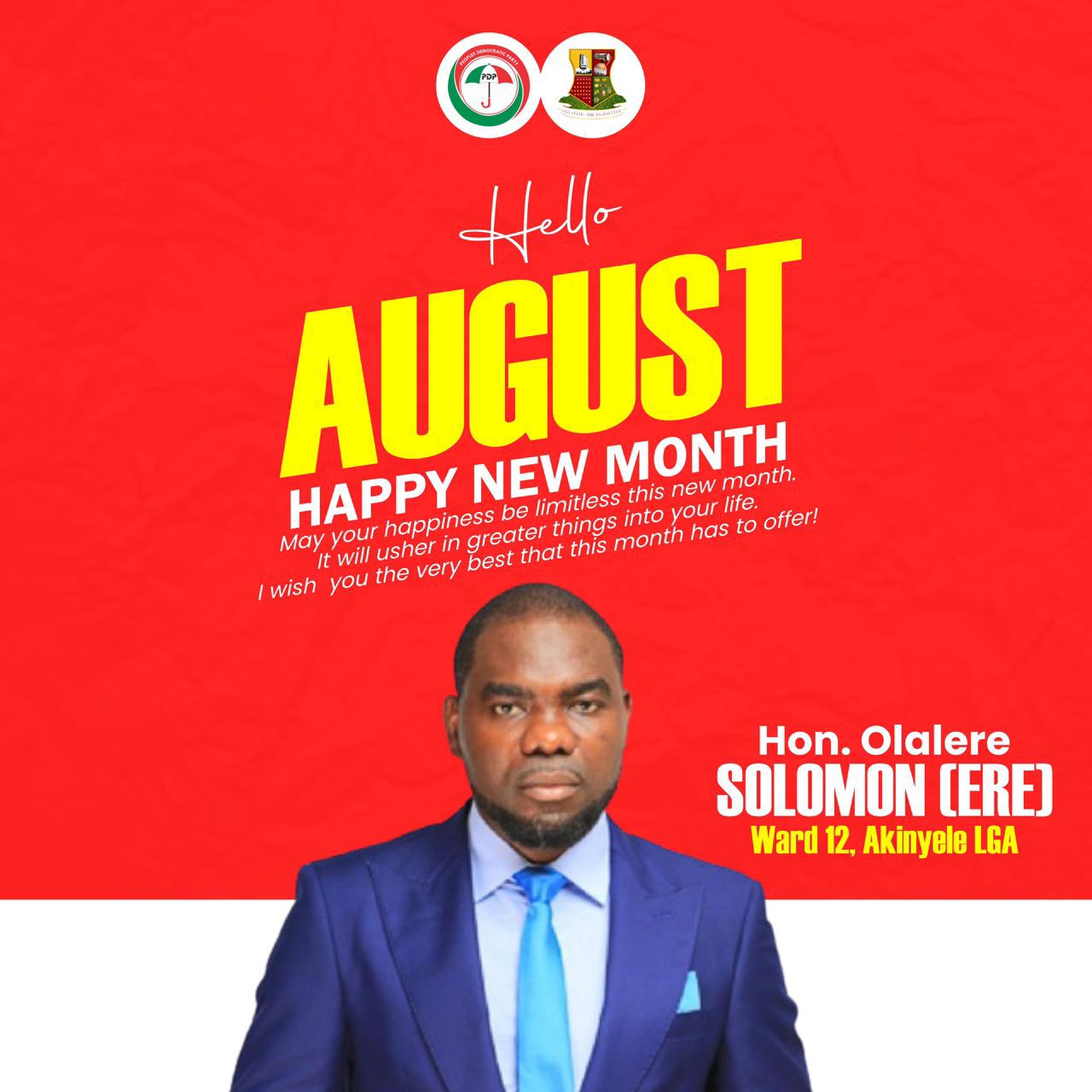 Hon. olalere Solomon Ere , a PDP stalwart, grassroots mobilizer, and philanthropist from Ward 12, Akinyele Local Government, extends his new month greetings to all Akinyele constituents. He urged everyone to welcome the month of August with a renewed sense of strength and unity.