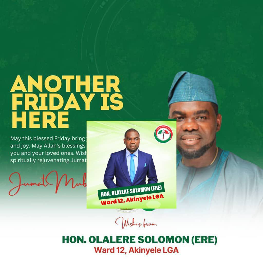 With a heart full of gratitude to Almighty Allah (SWT), Oloye Hon. Olalere Solomon (ERE) extends his heartfelt Jumu’ah Mubarak greetings to the dedicated members of the People’s Democratic Party (PDP), the resilient people of Akinyele Local Government, and the great people of Oyo State and beyond.