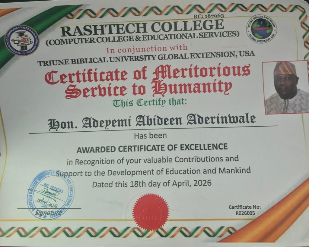 In a moment of well deserved recognition and celebration, the Chief of Staff to the Akinyele Local Government Chairman, Hon. Aderinwale Abideen Adeyemi, has been honoured with an Award of Excellence alongside a Certificate of Meritorious Service to Humanity. The prestigious recognition was conferred in appreciation of his remarkable contributions to the development of education and his unwavering commitment to the advancement of mankind.