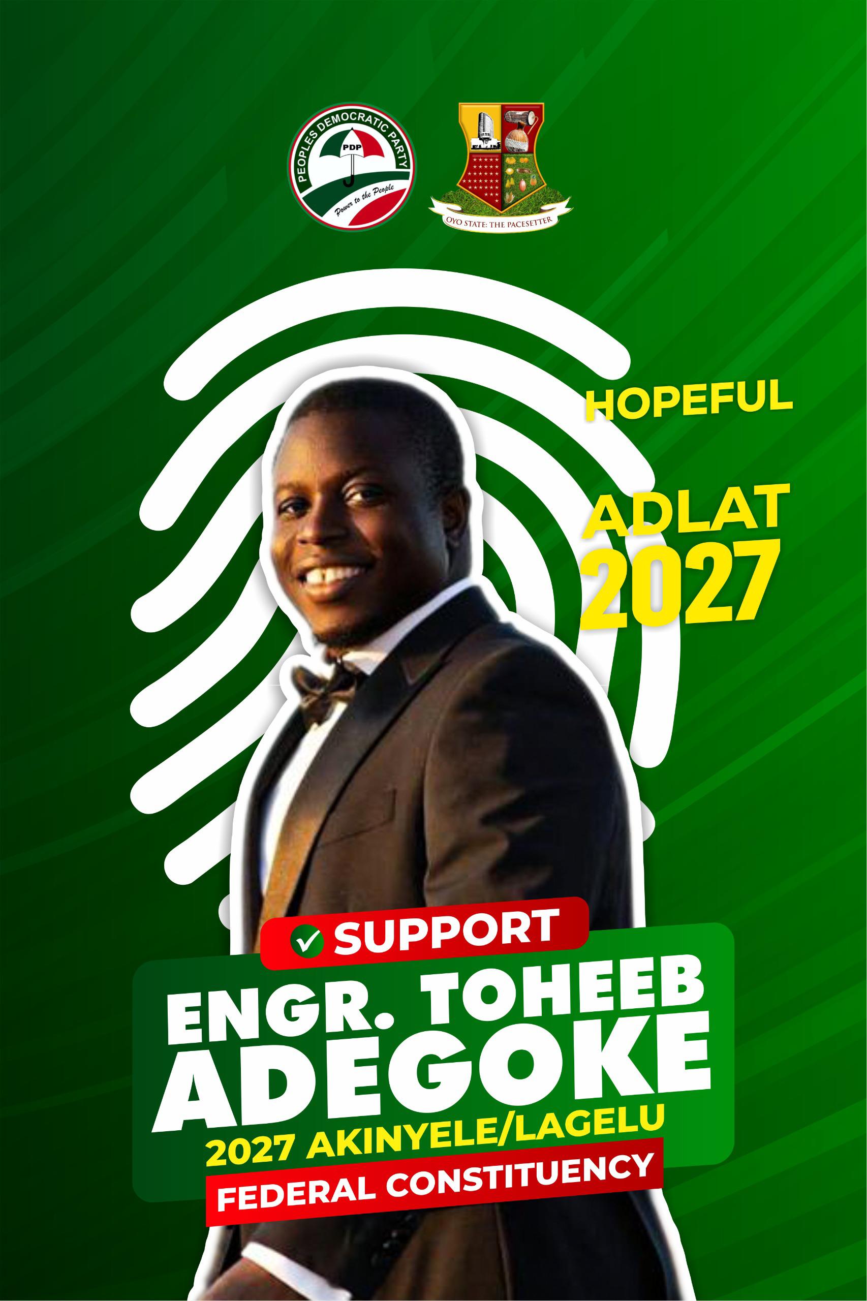 As the 2027 political landscape gradually comes into focus, Engr. Toheeb Adegoke ADLAT is emerging as a compelling voice for progressive change and purposeful leadership in Akinyele/Lagelu Federal Constituency. With a reputation built on competence, innovation, and grassroots engagement, Engr Toheeb Adegoke ADLAT represents a new generation of leaders determined to redefine governance beyond mere promises.