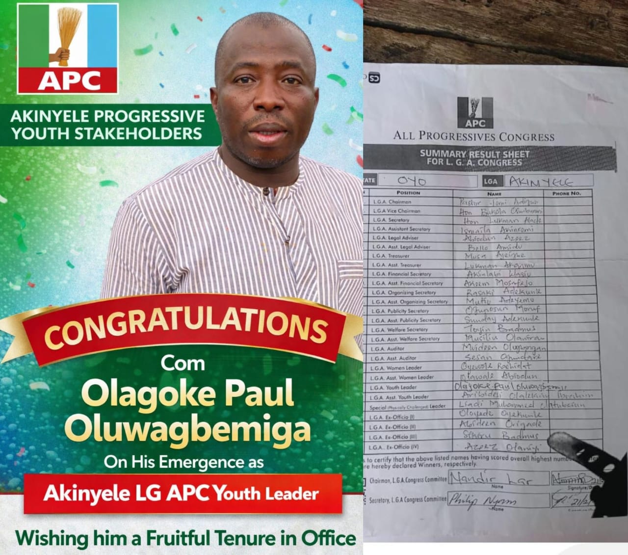 “We heartily congratulate the Immediate Past President of the Akinyele Youth Forum, Comrade Olagoke Paul Oluwagbemiga, on his emergence as the Akinyele Local Government APC Youth Leader. This achievement is a testament to his unwavering dedication, proven leadership capacity, and commitment to the growth of the party and youth development,” the Akinyele Progressive Youth Stakeholders declared in a statement made available by their spokesperson, Comrade Rasaq.